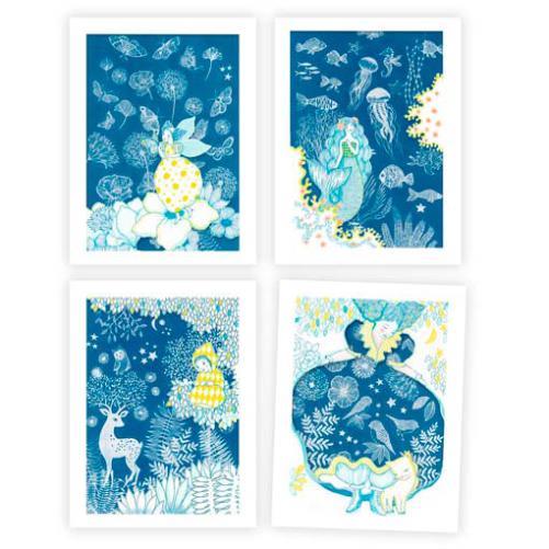 Esta atividade mágica baseia-se num processo fotográfico: a cianotipia. Utilizando padrões ópticos, é possível criar desenhos em papel fotossensível. Quando exposto à luz solar, é produzido um negativo dos padrões no papel. Depois, basta passar por água e ver como o desenho aparece no fundo azul! Estas criações são os cenários noturnos que servem de fundo aos 4 quadros poéticos e às suas ilustrações.