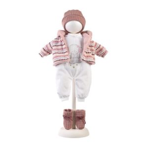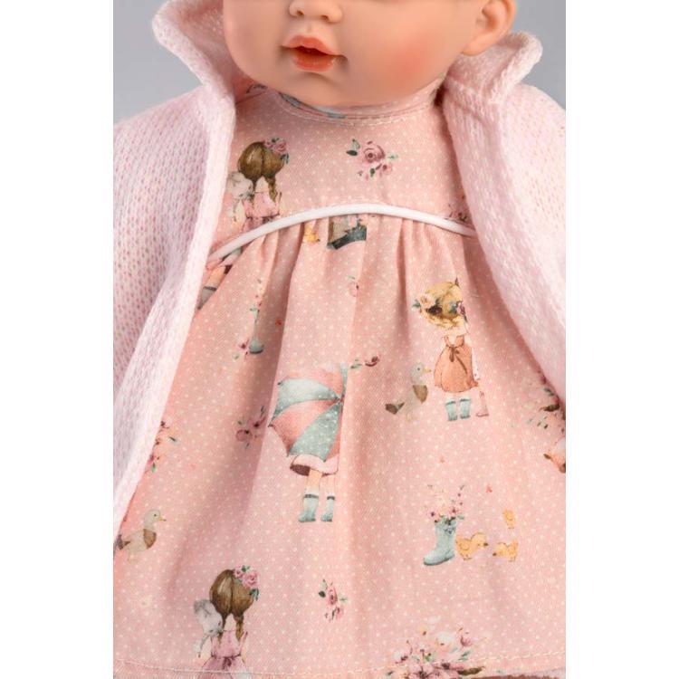 Boneca com 33 cm, de corpo mole, em tecido. A cabeça, braços e pernas são de vinil. Chora e diz “Mamã” e “Papá”. Chupeta incluída. Pilha: RL- 44. Roupa 100% Algodão – lavar com água fria. Feito à mão em Espanha.
