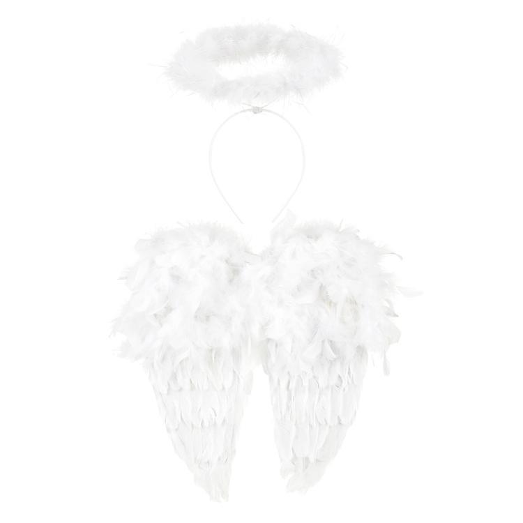 Conjunto de anjo, asas feitas de penas brancas + auréola. A altura das asas é de 40 cm.