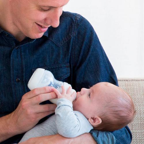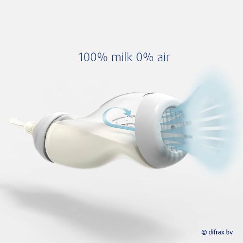 A válvula anti-cólica evita que se forme vácuo dentro do biberão garantindo um fluxo constante de leite enquanto o bebé estiver a mamar. O ar permanece no fundo do biberão e não é ingerido pelo bebé o que evita o bolçar, arrotar e as cólicas. A posição confortável e natural de alimentação proporcionada pelo biberão S Wide fomenta a criação de laços entre o pai e o bebé enquanto se alimenta – tudo graças ao formato especial em S!