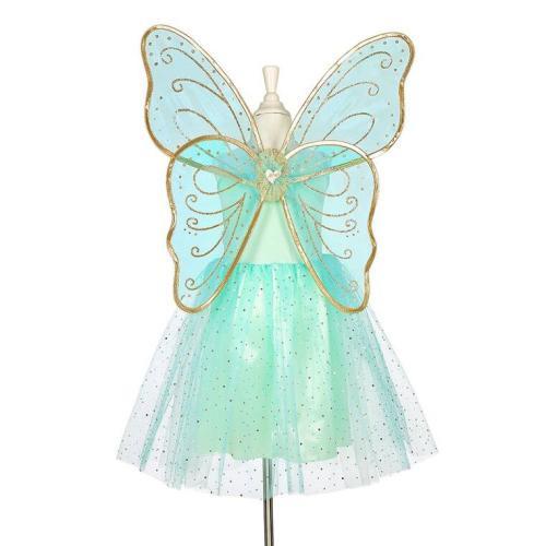 Fato vestido turquesa-dourado com asas de borboleta Camille da marca holandesa Souza! É um disfarce lindíssimo e cuidadosamente elaborado para meninas. O vestido tem corte clássico com alças ajustáveis e elástico na cintura. É macio e fácil de vestir por cima da cabeça, encantando pelos detalhes. A parte superior do vestido na frente tem costuras douradas e aplicação brilhante, e na cintura dois florzinhas e algumas folhinhas com bordas douradas. A parte inferior é uma saia simples em cetim com uma camada de tule turquesa-claro com pequenas lantejoulas douradas. O conjunto inclui asas turquesa semi-transparentes com desenhos dourados e bordas douradas, que podem ser usadas com o vestido ou separadamente, presas aos ombros com cómodas fitas elásticas revestidas de tecido. O fato é vistoso e confortável de usar, ideal para bailes de disfarces ou Réveillon, e também funciona como presente.