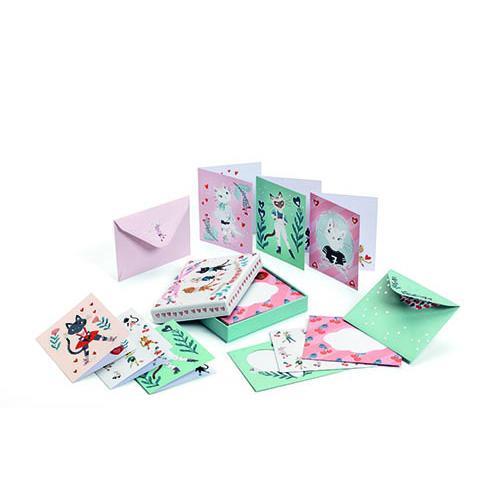 Conjunto de escrita. Efeitos metálicos em cada uma das caixas. Impressão metálica nos cartões e envelopes.