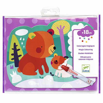 Um livro de colorir à base de água para crianças pequenas. Utiliza a caneta de aguarela para colorir as partes brancas dos animais e descobre o que está escondido. É mágico: os padrões aparecem e mudam de cor! Os quadros secam e as crianças podem recomeçar! Um lápis grande adaptado às mãos pequenas. Um suporte rígido para apoiar as 4 folhas. Folhas em plástico para repetires a atividade as vezes que quiseres. Bolsa de arrumação prática e fácil de transportar.