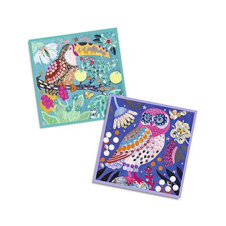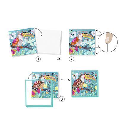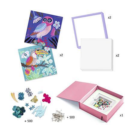 Lantejoulas em formas e cores extremamente variadas, uma moldura de papel para aperfeiçoar a tua criação e uma caixa com compartimento para guardar o material. Decora as imagens com as lantejoulas, deixando-as mais bonitas e brilhantes.