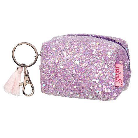 Carteira Lyna com porta-chaves. Material PU com glitter lilás cintilante. Dimensões: 9 x 6 x 5 cm.