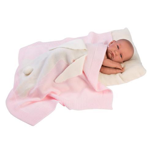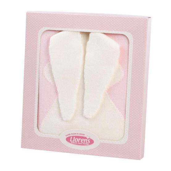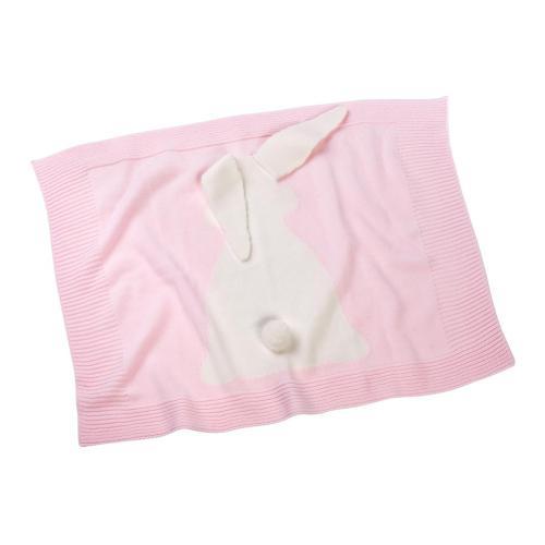 É rosa, com o desenho de um coelho, em branco. O pompom do rabo e as orelhas têm volume e saem fora da manta.