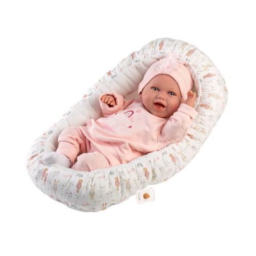Boneca com 40 cm, de corpo mole, em tecido. A cabeça, braços e pernas são de vinil. Ri e diz “Mamã” e “Papá”. Chupeta incluída. Pilha: RL- 44. Roupa 100% Algodão – lavar com água fria. Feito à mão em Espanha.
