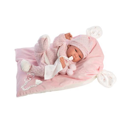 Boneca de 40 cm. Corpo em vinil, articulado. Inclui chupeta. Roupa 100 % algodão, lavar com água fria. Feito à mão, em Espanha. Pijama e gorro rosa, com apontamentos de lã e lacinhos rosa. Tem uma almofada rosa e branca com orelhinhas.