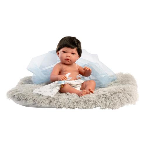 Boneco de 40 cm. Corpo articulado, em vinil suave. Inclui chupeta, doudou e almofada. Roupa em algodão, lavar com água fria. Feito à mão, em Espanha.