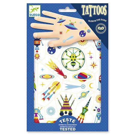 Duas folhas de tatuagens temporárias que brilham no escuro com o tema do espaço. Para maior alegria das crianças, surpresas e pequenos detalhes fosforescentes aparecem no escuro! Fáceis de usar, estas tatuagens já vêm pré-cortadas e aplicam-se com um pouco de água.