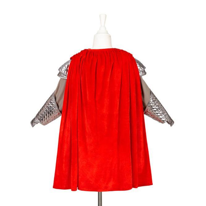 Rei Artur com armadura cinza e escudo bordado no peito, e capa vermelha de veludo. A camisola de manga comprida tem detalhes metálicos acolchoados nos braços e ombros, tornando o disfarce mais realista. Combina o disfarce com a coroa como acessório