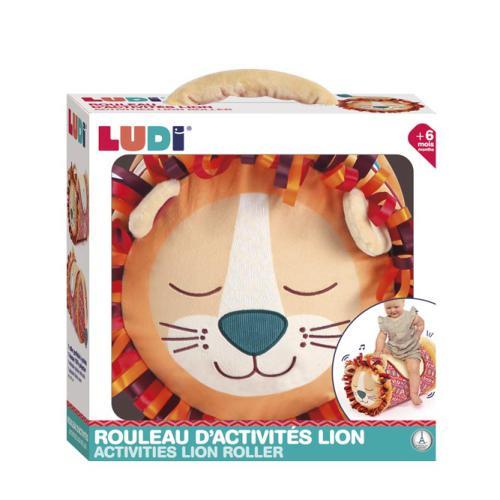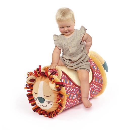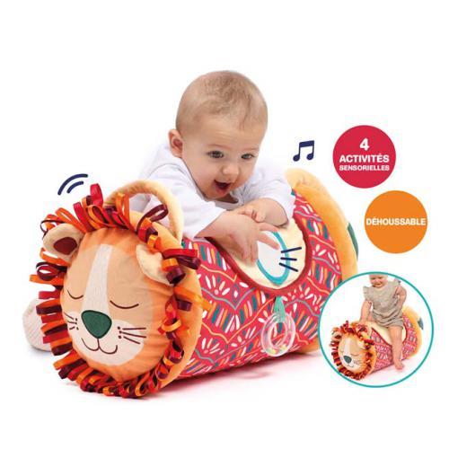 Um rolo de atividades muito divertido! O rolo de atividades “Leão” é um cilindro insuflável com uma capa muito macia. Ajuda os mais pequenos no desenvolvimento da motricidade e na coordenação dos movimentos. Indicado para crianças a partir dos 6 meses, os bebés podem rolar, andar ou subir para o brinquedo e testar o seu equilíbrio com a ajuda da pega. As suas texturas são suaves e as 5 atividades sensoriais despertam a curiosidade, o espelho para estimula a visão e os sons afinam a audição.Dimensões: 27 cm de diâmetro e 40 cm de altura. Material 100% poliéster. Forra lavável.