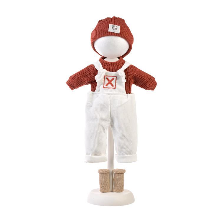 Camisola de malha tijolo com gorro a condizer, e macacão bege para boneco 42cm.