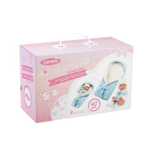 Camisola branca com tapa fraldas em azul. Gorro em branco com laço azul, botinhas brancas com pompons e laços, cachecol azul em malha com pompons e manta azul e branca com pelo e laço.