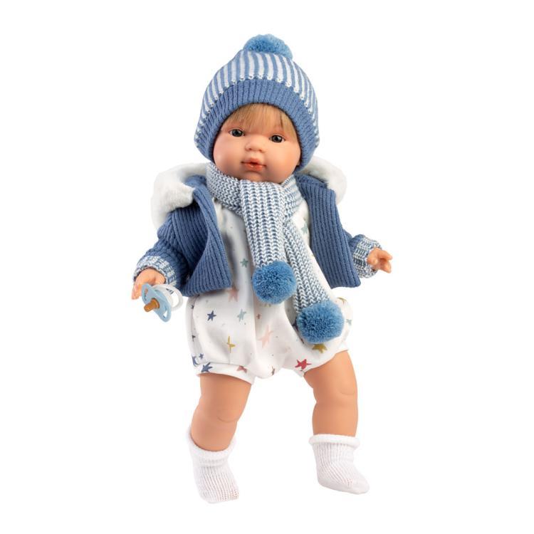 Boneca com 38 cm, de corpo mole, em tecido. A cabeça, braços e pernas são de vinil. Chora e diz “Mamã” e “Papá”. Chupeta incluída. Pilha: RL- 44. Roupa 100% Algodão – lavar com água fria. Feito à mão em Espanha.