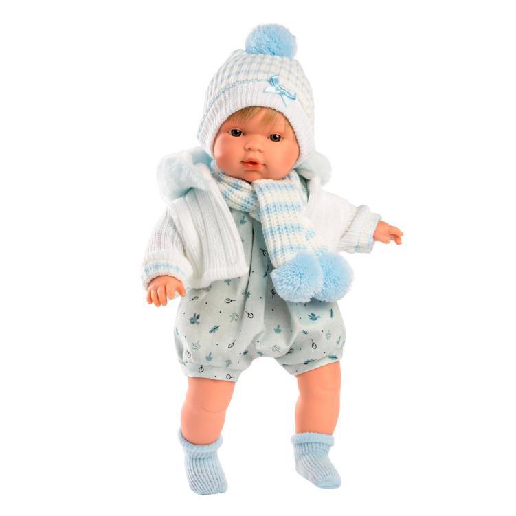 Boneco de corpo macio, com 38 cm. A cabeça, braços e pernas são de vinil, agradável ao toque. Quando perde a chupeta, chora e diz mamã e papá. Chupeta incluída. Pilha: RL- 44. Roupa 100% Algodão – lavar com água fria. Feito à mão em Espanha.