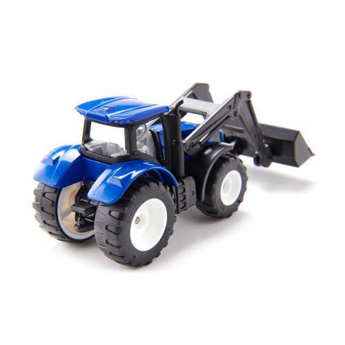 A ferramenta e o trator ideais são o trator New Holland com carregador frontal. Este pode ser utilizado para carregar fardos de feno e silagem, armazenar alimentos para animais ou efetuar simples trabalhos de terraplanagem. O carregador frontal pode ser movido para cima e para baixo de forma realista e a cabine também pode ser removida. Muitos reboques siku podem ser engatados no engate do reboque. O potente trator tem pneus de borracha com o design da New Holland.