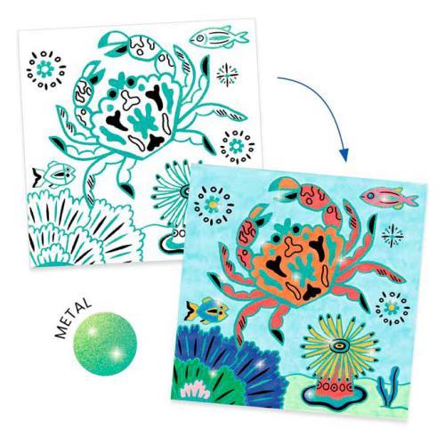 Uma atividade de pintura que te leva a explorar o fundo do mar, onde podes colorir ilustrações marinhas guiadas por contornos dourados em relevo que te ajudam a pintar com precisão dentro das linhas, criando cenas cheias de cor e detalhe de forma simples e divertida. Técnica de pintura guiada. Desenvolve a coordenação e a precisão.